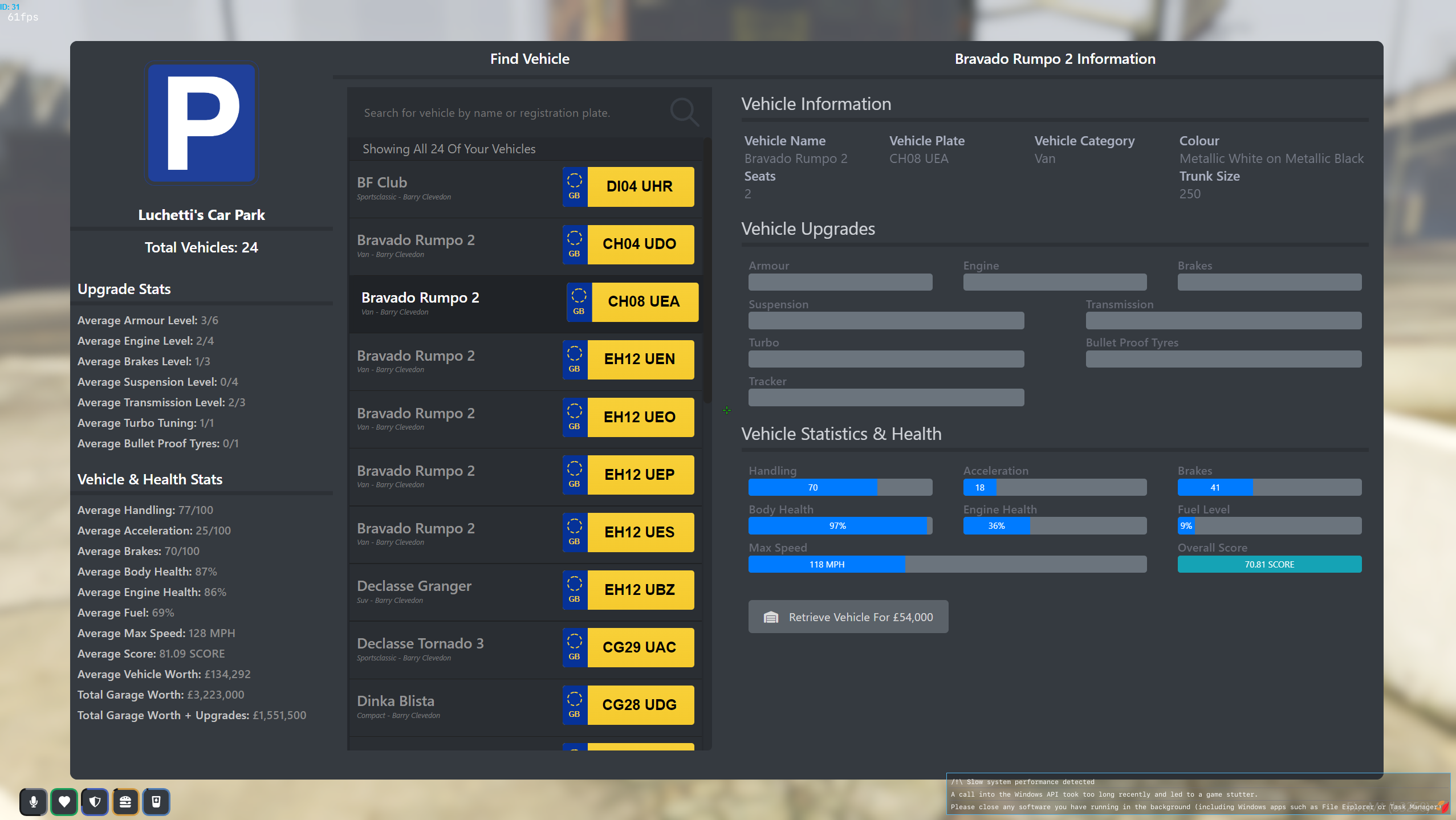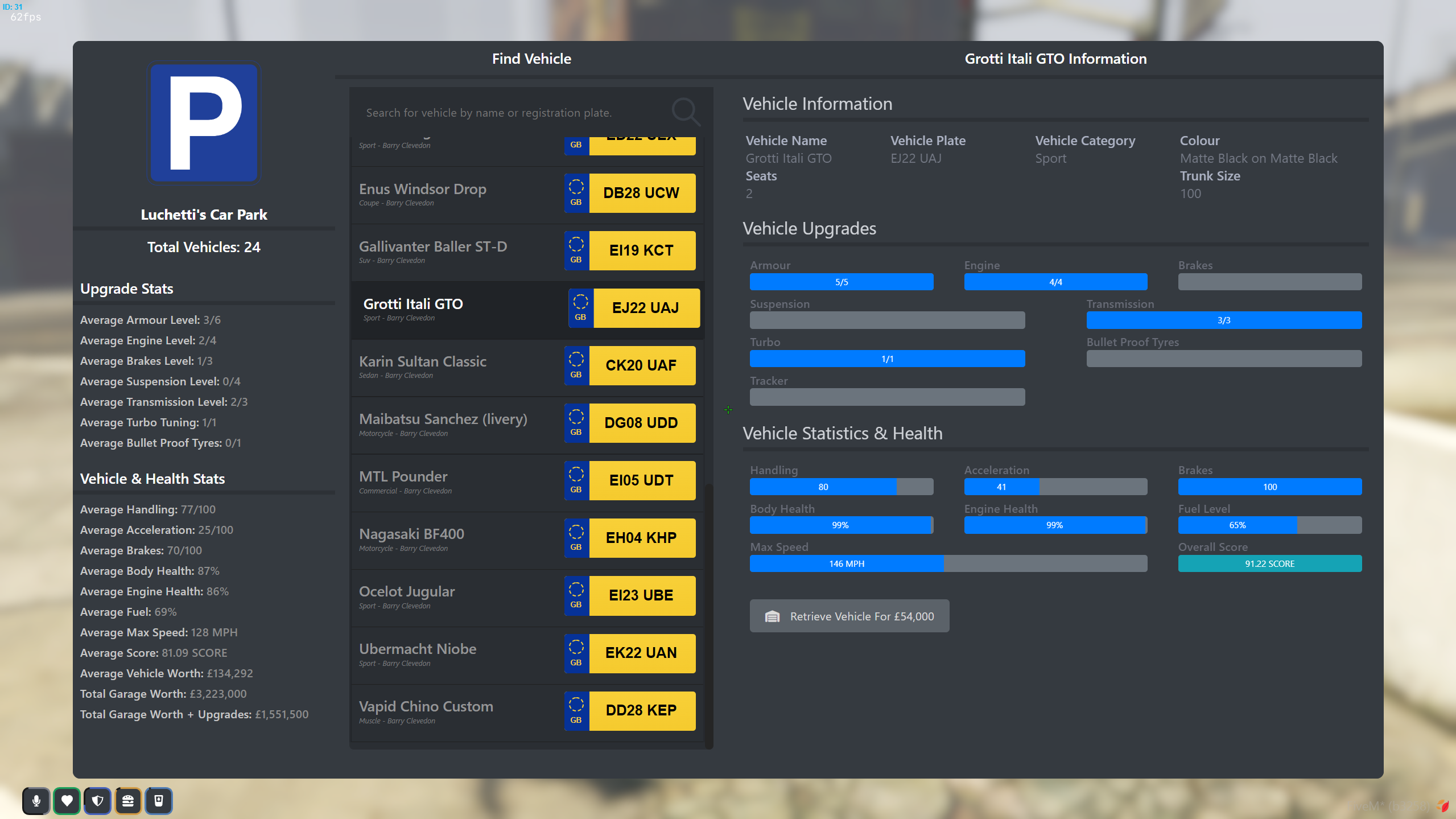 Provide a full description of the bug: There seems to be some sort of bug where each car seems to cost £54,000 to be retrieved from the storage. I am hoping this is a bug as i have got cars such as deludamol vans that cost 54k to release (more expensive than the vehicle itself) and then super cars are also 54k to be released. In all honesty i feel bad for new players with only 200k pulling their tornado out for 54k.