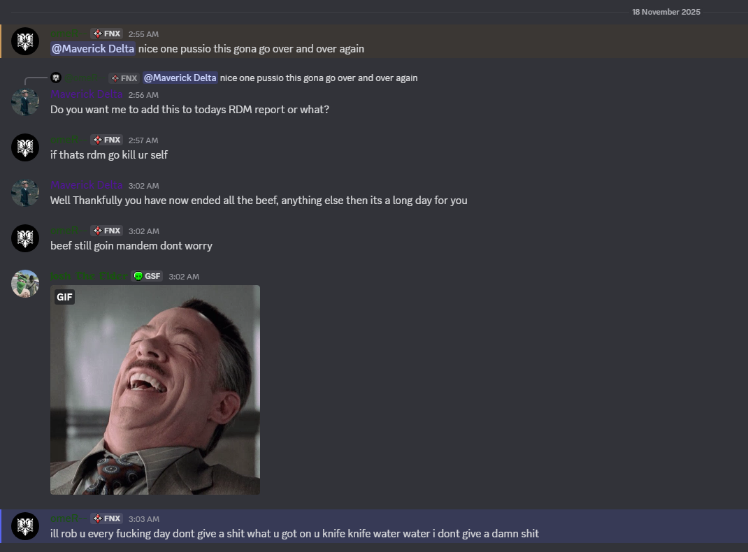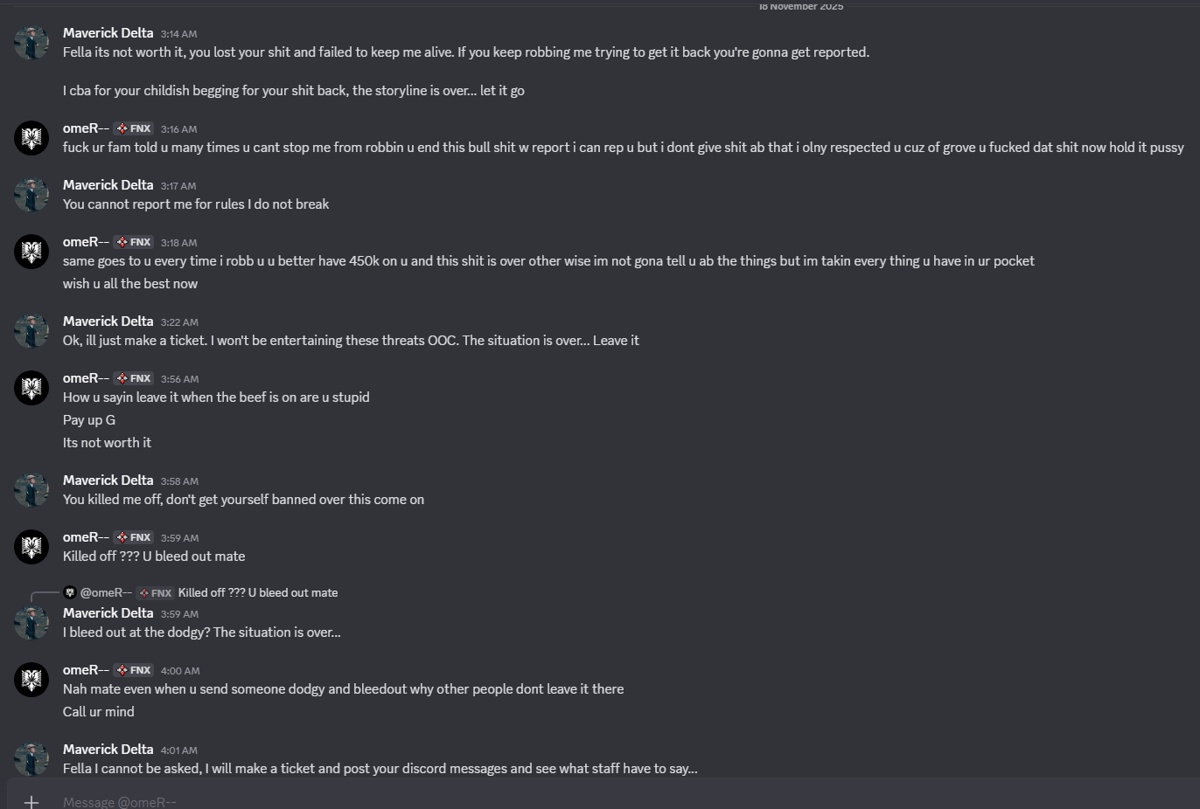 I then receive this message on discord where Omz starts off trying to Ego what happened and when I respond I get told to "go kill ur self". Additionally I make a comment regarding the "Beef" ending as I was killed off, which he then claims the beef is still going and implied he will keep robbing me and somewhat implies he is going to pocket wipe me.